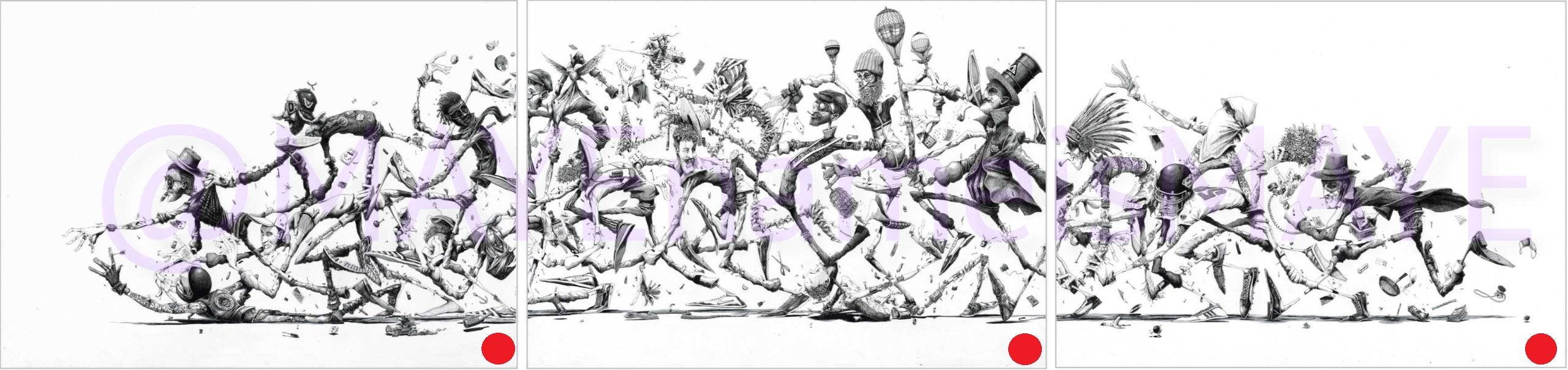 Le « Triptyque » est un ensemble de 3 sérigraphies de 70cm x 50cm ce qui représente une longueur totale de 2 mètres et 10 centimètres, sur une hauteur de 50 centimètres.